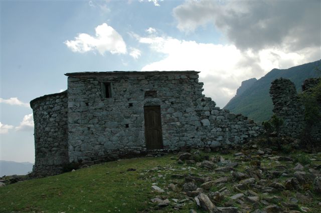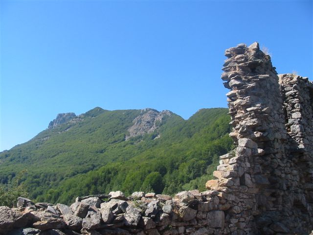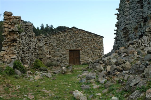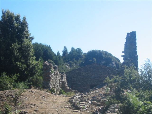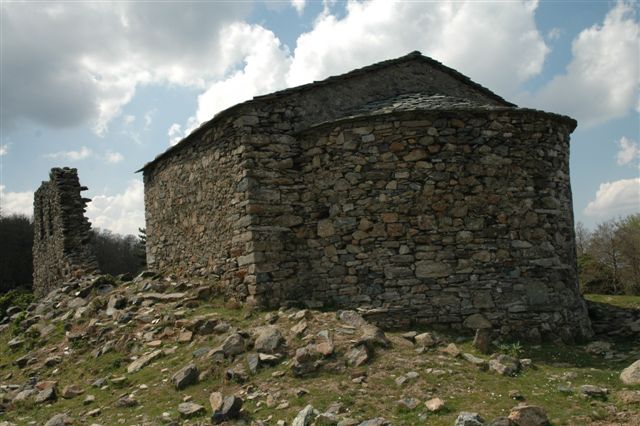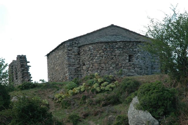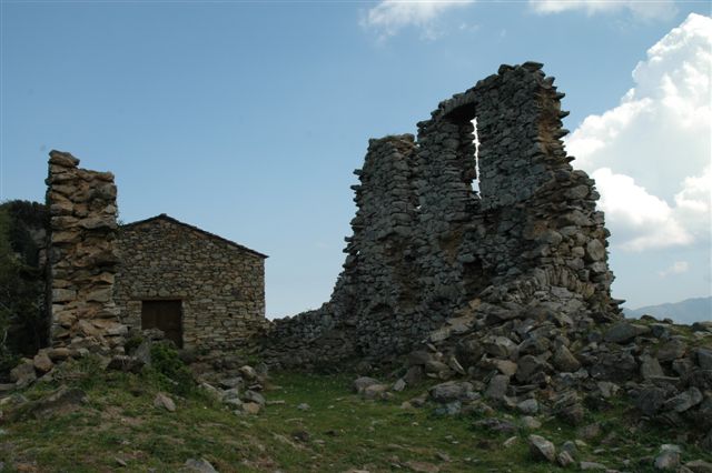 Ruines et l'église de San Petro d'Accia. Col de Prato (985 m). Mon San Petrone 1767. Chapelle Saint-Pierre d'Accia 17ème siècle, perchée sur un col à l'ouest du Mont San Pedrone.