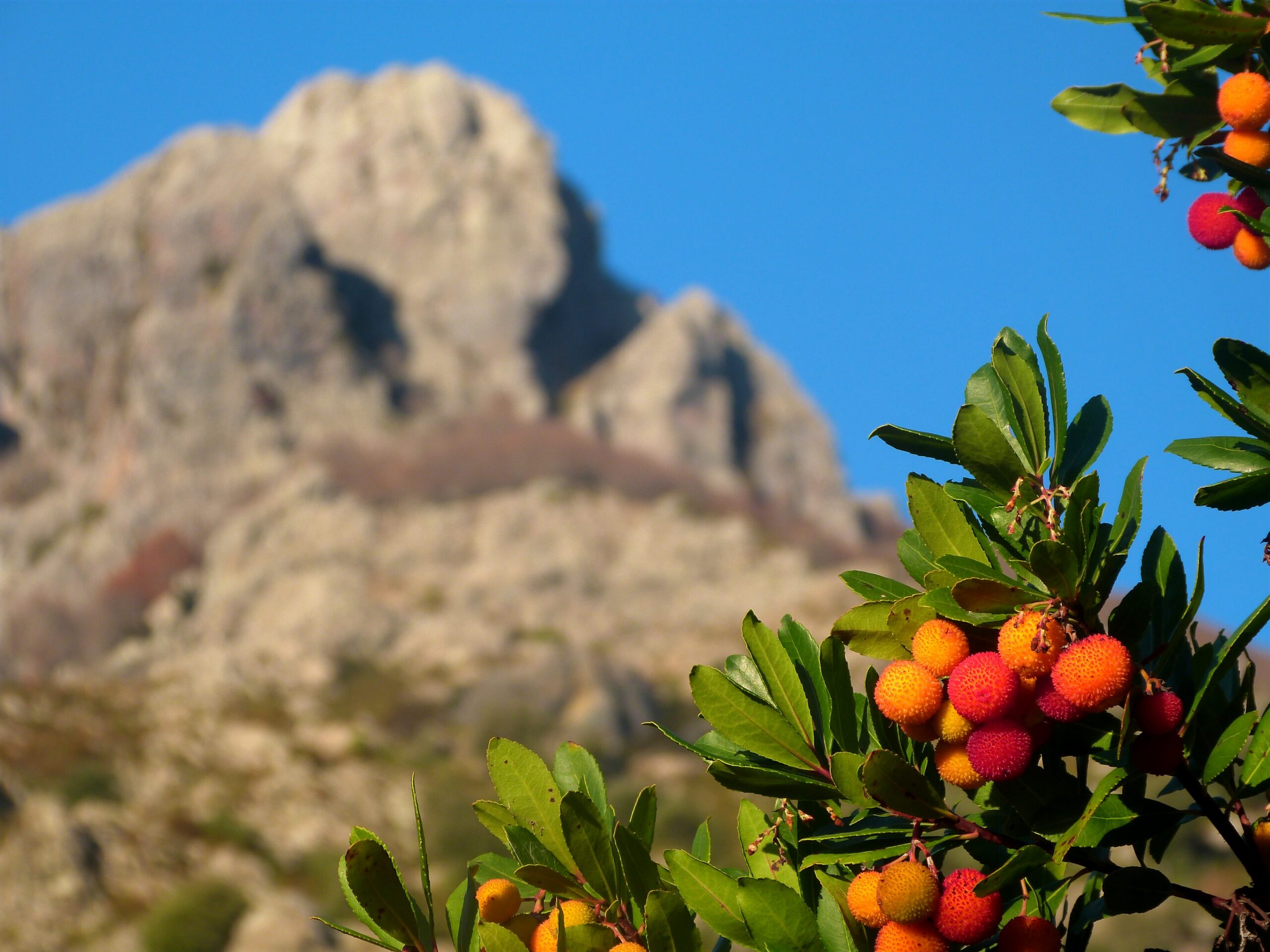 Très répandu en Corse, l’arbousier est un arbre pouvant atteindre entre 5 et 15 mètres de haut. L’arbousier est avec l’oranger le seul arbre à porter simultanément des fleurs et des fruits. L’écorce de l’arbousier est d’un gris un peu brun alors que son bois est brun foncé presque rouge et ses feuilles d’un vert éclatant. Les fleurs de l’arbousier sont blanches tirant sur le vert pale en forme de clochettes et pendent en grappes en même temps que les fruits apparaissent de septembre à janvier. Les fruits de l’arbousier sont les arbouses qui sont des fruits sphériques allant du jaune clair au rouge écarlate en passant par l’orange tout au long de la maturité. L’arbouse est recouverte d’une enveloppe portant de petites aspérités en forme de picots émoussés donc inoffensifs qui rappelle la fraise chinoise.L’arbousier portant ses fruits pendant plus d’une année, ceux-ci sont notamment consommables en hiver où l’apport en vitamine C qu’ils procurent est appréciable. En lui-même, de par ses fleurs blanches et ses fruits multicolores l’arbousier fait songer à un arbre qui aurait été décoré pour Noël. Peu parfumée l’arbouse a une chair blanc nacré un peu farineuse, acidulée et sucrée qui devient délicieuse en confitures, gelées, glaces et sorbets. L’arbouse peut également être macérée dans du vinaigre comme condiment, dans de l’alcool ou distillée, en Corse, il existe une bière parfumée à l’arbouse. (https://www.lacorse.info/la-corse/la-flore-corse/l-arbousier-corse/)